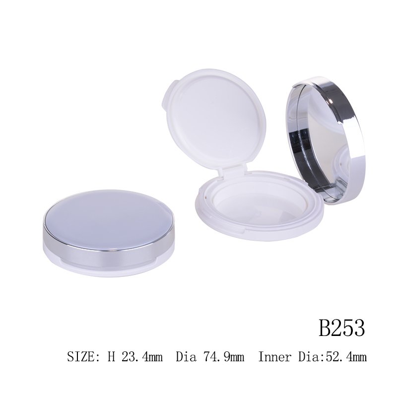 The B253 Cushion Compact Case is a premium round cosmetic container, ideal for liquid foundation, BB cream, or cushion formulations. Featuring a sleek silver rim, glossy white base, and a built-in mirror, it offers both sophistication and practicality — perfect for upscale cosmetic lines.